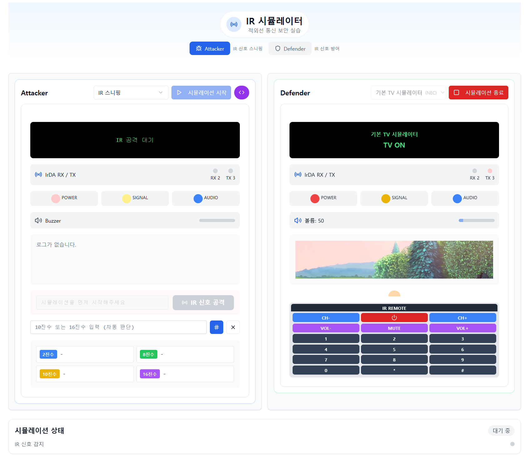수많은 아이디어 중, 가장 직관적이고 재미있는 경험을 줄 수 있는 'IR(적외선) 시뮬레이터' 모듈이 첫 번째로 완성되었습니다. 바로 어제, 30명의 학생들과 함께 이 IR 시뮬레이터로 첫 수업을 진행하며 성공적으로 테스트를 마쳤습니다. 학생들은 실제 리모컨 없이도 가상의 TV를 켜고 끄며, IR 신호를 훔치고(Sniffing) 재전송하는(Replay Attack) 해킹의 기본 원리를 즐겁게 체험했습니다. 이제 막 첫 단추를 끼웠지만, 이 교육 방식의 가능성을 엿볼 수 있었던 의미 있는 시간이었습니다. 학생들의 피드백을 통해 개선과 향후 개발에 큰 도움이 되었습니다.